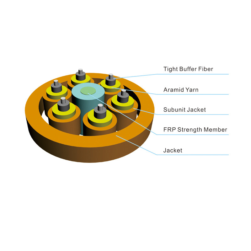 Кабель Break-Out использует одножильный кабель (Φ900µm плотное буферное волокно, арамидная пряжа в качестве силового элемента) в качестве субъединицы. Армированный пластик (FRP) расположен в центре сердечника в качестве неметаллического силового элемента. Субъединицы скручены вокруг сердечника кабеля. Кабель завершается оболочкой из ПВХ или LSZH (низкий дым, без галогенов, огнестойкий).